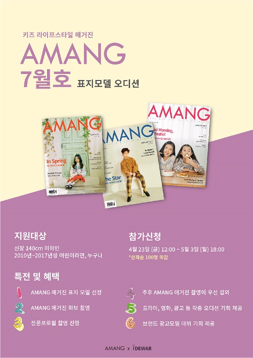 AMANG 표지 모델에 관심이 있는 140cm 이하 신장의 2010~2017년생 어린이라면 누구나 참여가 가능하다. 참가 신청은 4월 19일부터 28일까지 10일간 진행되며, 이 중 선착순 100명을 뽑아 5월 6일부터 20일간 인기투표를 진행한다. 투표 종료 후 5월 26일부터 5일간 전문가 심사를 거쳐 5월 31일에 선발된 키즈 모델들을 최종 발표하고 6월 중에 촬영을 진행한다.