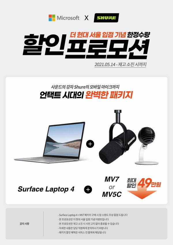이번 행사에서 음향기기 전문 브랜드인 SHURE사의 USB 마이크인 ‘MV5C’와 USB와 XLR 연결이 모두 가능한 하이브리드 마이크 ‘MV7’을 서피스 랩탑 4와 각각 패키지로 묶어 독점 판매하며, 서피스 랩탑 4와 MV7 마이크 패키지를 구매하는 고객에게는 마이크 전용 암 스탠드를 선착순 무상 증정하는 행사도 진행한다.