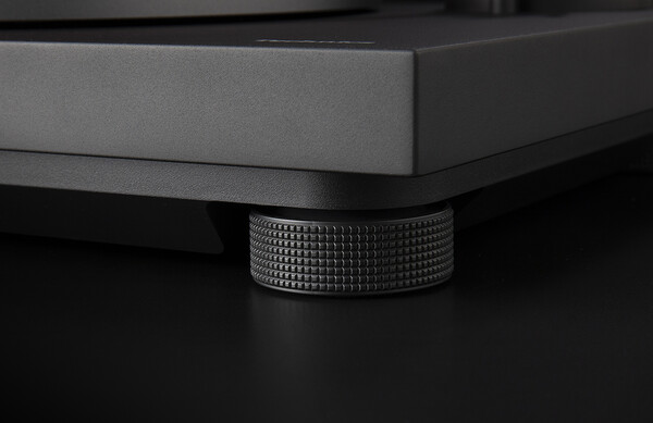 이 턴테이블의 플린스는 눈으로 보이는 것처럼 상급기와 제법 차이가 난다. 형태는 흔히 볼 수 있는 일반적인 직사각형의 판 형태로 되어 있으며, MDF 소재의 상판 아래에 합성수지의 하판이 결합된 모습이다. 물론 상위 모델처럼 높은 강도와 진동 제어를 위해 알루미늄 다이캐스트 섀시 안에 ABS와 유리 섬유가 혼합된 특수 소재가 들어 있는 구조는 아니지만, MDF 소재 자체가 가진 진동에 강한 특성이 이 턴테이블에 좋은 영향을 줄 것 같다. 당연히 MDF 소재 자체가 나쁜 것은 아니다. 대부분의 턴테이블이 이 소재를 사용하고 있다. 그리고 플린스 바닥에 있는 인슐레이터는 진동 저항성과 저소음을 위해 새롭게 튜닝되었으며, 회전시키는 방식으로 높이를 조절해 턴테이블의 수평을 맞출 수 있다. 더스트 커버는 SL-1200MK7같이 분리되는 것이 아니라 열리고 닫히는 일반적인 방식으로 되어 있다.