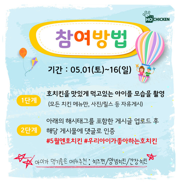 지난 5월 1일부터 시작된 이번 이벤트는 오는 16일까지 참가할 수 있다. 호치킨의 치킨을 주문한 뒤, 아이와 함께 먹는 모습을 자신의 SNS(페이스북, 인스타그램)에 사진 및 릴스, 동영상 등의 형태로 게시한 후에 호치킨 공식계정에 댓글을 남기면 된다. 당첨자는 종료일 다음날인 17일에 개별 발표한다.