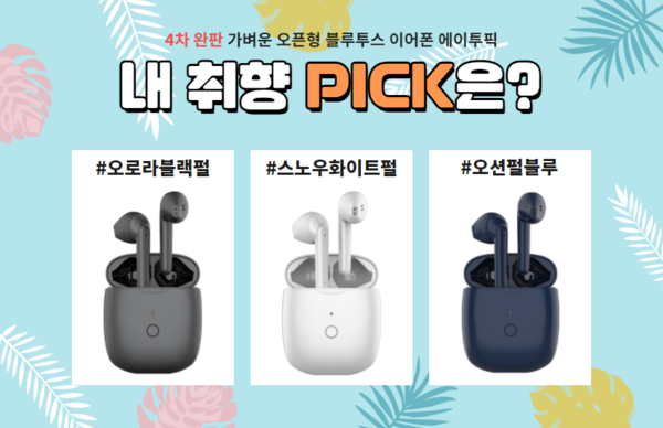 에이투픽은 오픈형 블루투스 이어폰으로 블루, 블랙, 화이트 3가지 색상으로 출시됐다.