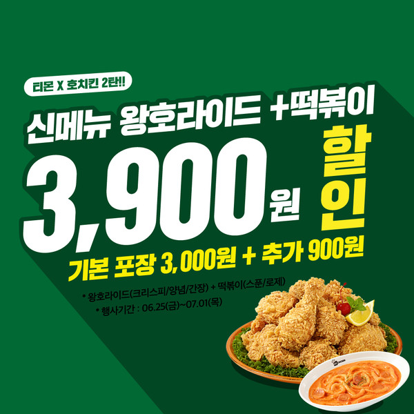 오는 6월 25일(금)부터 7월 1일(목)까지 호치킨에서 신메뉴 출시기념 티몬치킨이벤트를 진행한다고 전했다. e 쿠폰으로 이용하여 구매할 수 있는 프로모션으로 3,900원 할인된 가격으로 이용할 수 있다. 왕호라이드 기본포장 3,000원에 900원을 더한 금액으로 보다 경제적인 구매가 가능하다.